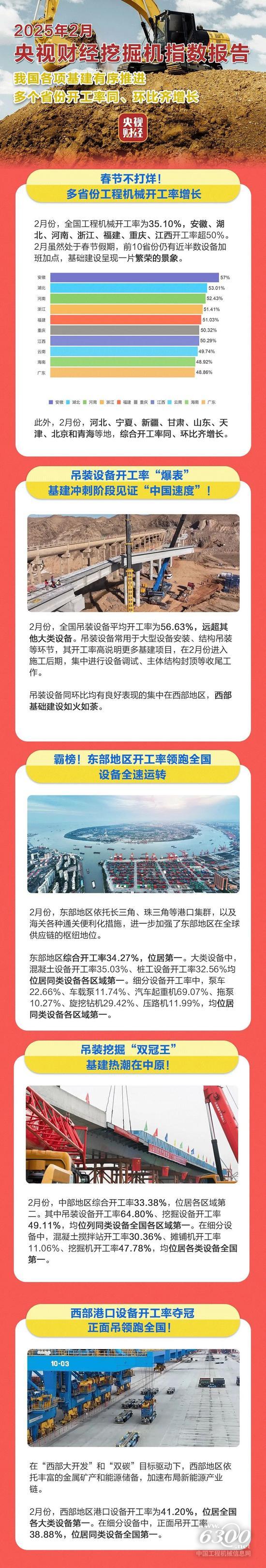 2月份,中部地区综合开工率33.38%,位居各区域第二。其中吊装设备开工率64.80%、挖掘设备开工率49.11%,均位列同类设备全国各区域第一。在细分设备中,混凝土搅拌站开工率30.36%、摊铺机开工率11.06%、挖掘机开工率47.78%,均位居各类设备全国第一。
