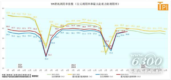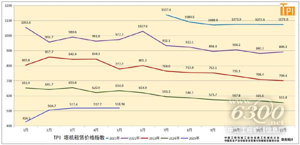 据中国工程机械工业协会施工机械化分会等统计的塔机租赁行业景气指数(TPI),2025年5月份塔机台天利用率56.8%,最大起重力矩利用率56.7%(系近3年最大起重力矩利用率首次低于台天利用率),分别较上月高1.2个百分点和0.8个百分点;5月份租赁价格指数为518.96点,较上月高1.26点,但低于去年同期115点。