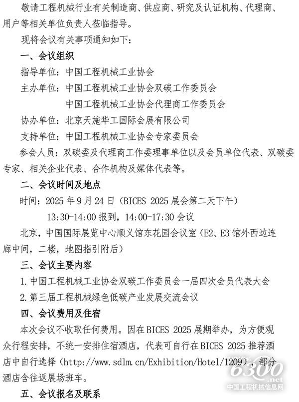 为深入贯彻落实《国家发展改革委等部门关于加快建立产品碳足迹管理体系的意见》(发改环资〔2023〕1529号),生态环境部、住房城乡建设部等15部委联合发布《关于建立碳足迹管理体系的实施方案》(环气候〔2024〕30号),《国家发展改革委、财政部印发〈关于加力支持大规模设备更新和消费品以旧换新的若干措施〉的通知》(发改环资〔2024〕1104号)等文件精神;加速推进中国工程机械行业的电动化、低碳化转型进程,赋能行业绿色可持续、高质量发展;经研究决定,中国工程机械工业协会双碳工作委员会(以下简称“双碳委”)拟于 BICES 2025 展会同期,组织召开“中国工程机械工业协会双碳工作委员会一届四次会员代表大会”,同期双碳委和中国工程机械工业协会代理商工作委员会(以下简称“代理商工作委”)联合组织召开“第三届工程机械绿色低碳产业发展交流会议”,会议主题为“碳迹溯源 认证护航 电驱未来”。