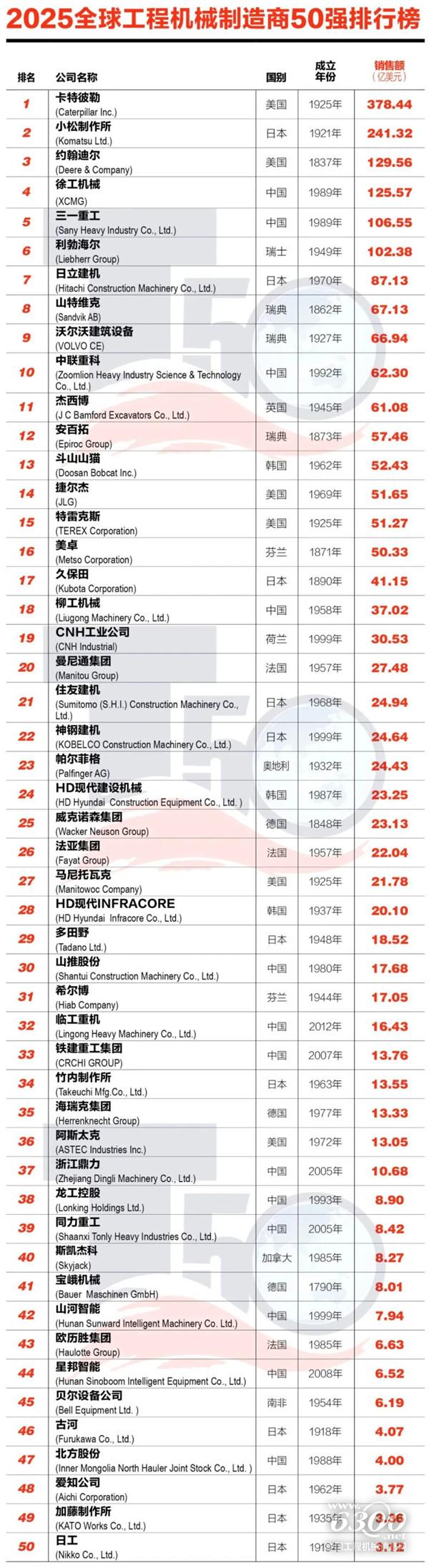 全球工程机械制造商50强榜单,由全球工程机械50强峰会组委会和《中国工程机械》杂志联合发布,自1999年首次发榜至今,已持续发布26届。50强榜单以企业销售额为排名依据,真实反映了企业在全球工程机械产业的地位。