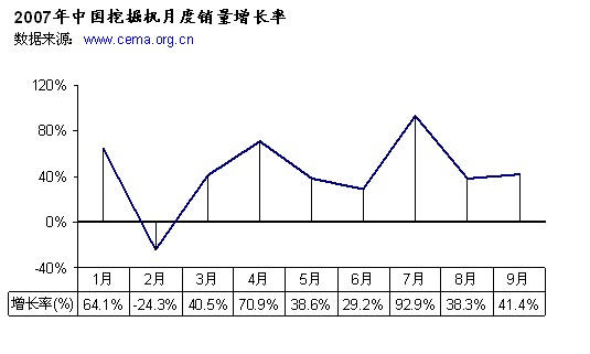 中国工程机械工业协会挖掘机分会统计数据显示,参加协会CEMA挖掘机销售统计的国内主要20家挖掘机制造公司2007年9月份总计销售4,4218台,较2006年同比大幅增长超过41%。