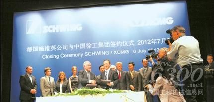 2012年徐工跨国并购全球混凝土机械领军企业德国施维英公司等3家欧洲企业,强力推进国际化战略性产业布局发展。图为2012年7月6日在德国举行的股权交割仪式上,徐工集团董事长王民与施维英公司施维英先生代表双方签字。