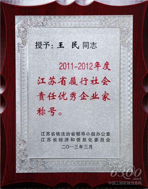 9月6日,江苏省经信委、江苏省依法治省领导小组办公室、江苏省依法经营协调指导办公室联合向徐工集团董事长王民董事长颁发了“2011-2012年度全省履行社会责任优秀企业家”奖牌和证书。