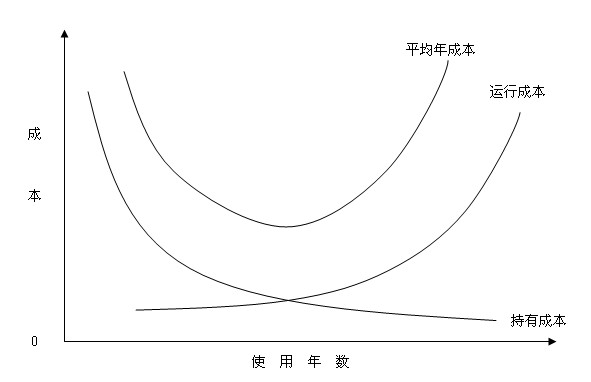 工程机械设备的使用初期运行费用较低,随着设备的使用,性能逐渐变差,维护费用、修理费用、能源消耗等会逐步增加。与此同时设备的价值逐渐减少,设备资产占用的资金应计利息会逐渐减少,随着时间的递延,运行成本和持有成本呈反方向变化,两者之和成马鞍形。马鞍形的平均年成本可用下式表示: