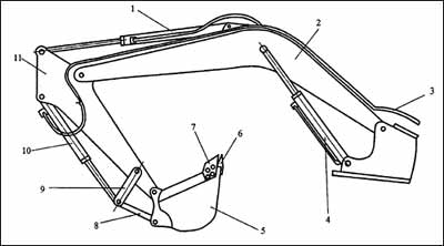 1—斗杆油缸;2—动臂;3—油管;4—动臂油缸;5—铲斗;6—斗齿;7—侧齿;8—连杆;9—摇杆;10—铲斗油缸;11—斗杆