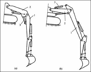 2)组合式动臂。如图2所示,组合式动臂用辅助连杆或液压缸3或螺栓连接而成。上、下动臂之间的夹角可用辅助连杆或液压缸来调节,虽然使结构和操作复杂化,但在挖掘机作业中可随时大幅度调整上、下动臂之间的夹角,从而提高挖掘机的作业性能,尤其在用反铲或抓斗挖掘窄而深的基坑时,容易得到较大距离的垂直挖掘轨迹,提高挖掘质量和生产率。组合式动臂的优点是,可以根据作业条件随意调整挖掘机的作业尺寸和挖掘力,且调整时间短。此外,它的互换工作装置多,可满足各种作业的需要,装车运输方便。其缺点是质量大,制造成本高,一般用于中、小型挖掘机上。