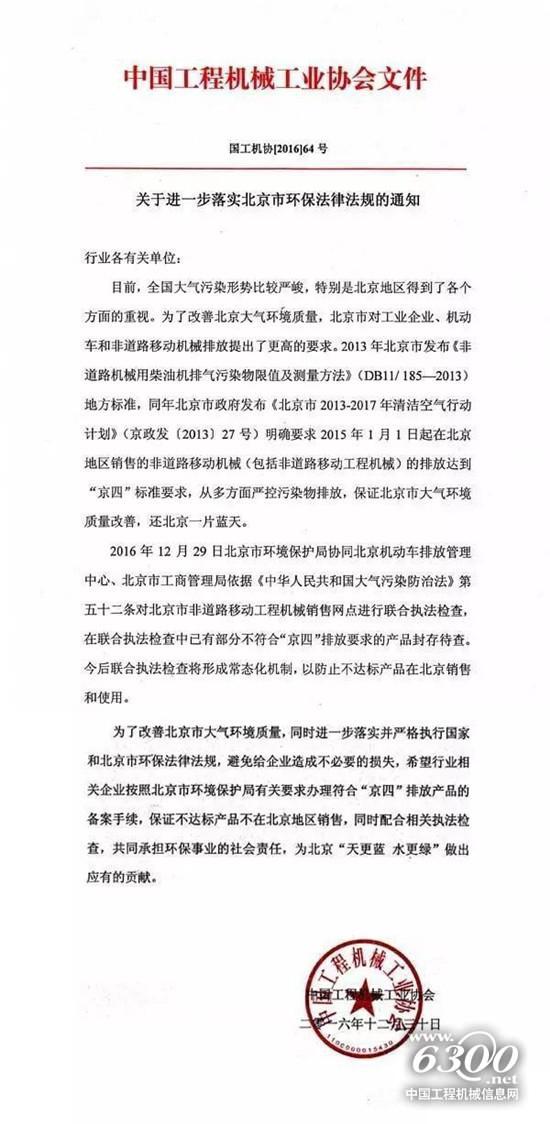 2016年12月29日北京市环境保护局协同北京机动车排放管理中心、北京市工商管理局依据《中华人民共和国大气污染防治法》第五十二条对北京市非道路移动工程机械销售网点进行联合执法检查,在联合执法检查中已有部分不符合“京四”排放要求的产品封存待查。今后联合执法检查将形成常态化机制,以防止不达标产品在北京销售和使用。