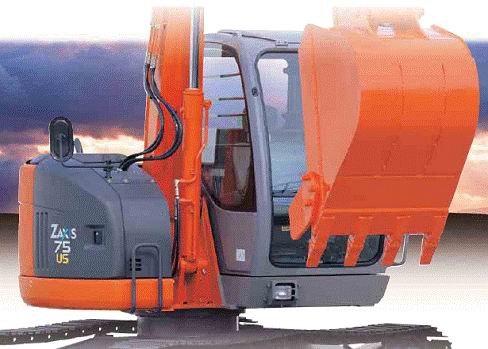 日立建机公司新推出的Zaxis系列中的ZX75US中型无尾挖掘机整机操作质量8035kg,配有54hp发动机,标准斗容0.28m3,牵引力达到5600kg。