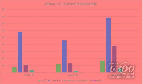 其中,6~10t始终占据最畅销机型,一季度累计销量1822台,占轮挖总销量的62%;大型轮挖(28.5t以上)一季度累计销量9台。