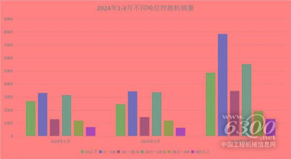 2024年1-3月,挖掘机整体销量延续下滑趋势,但具体细分市场表现各有差异。(下文中挖掘机各机型范围为:小挖≤18.5t,中挖为18.5t~28.5t,大挖为≥28.5t)