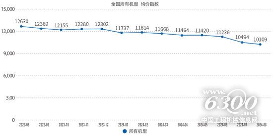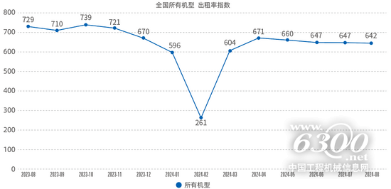 2024年8月升降工作平台出租率指数为642点,环比处于微降状态、同比下降11.93%。总体看8月份升降工作平台各机型出租率环比有升有降,3类机型略有增长,另外5类有所下降,其中环比出租率下降幅度最大的机型为36~39m以上(含36m、39m),降幅11.82%,环比出租率增长最大的机型为14~16m(含14m、16m),涨幅6.03%。2024年8月出租率同比下降幅度较大,所有机型出租率指数同比均处于下滑态势,其中40m以上机型降幅最大,达到16.51%。(出租率是以台天数为基准进行计算,100%出租率对应1000点。)