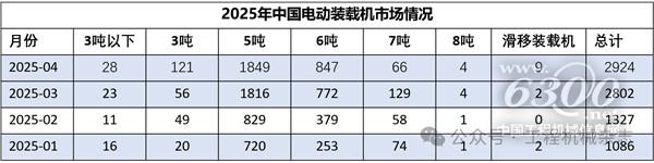 2025年4月销售电动装载机2924台( 3吨以下28台,3吨121台,5吨1849台,6吨847台,7吨66台,8吨以上4台,滑移装载机9台)。